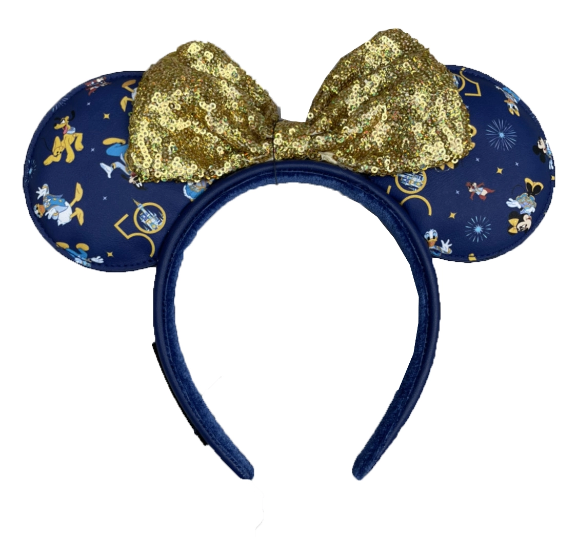 Be sure to celebrate with these fun Minnie Ears by Loungefly. Features Mickey Mouse & Friends with a Gold sequin bow and Gold Walt Disney World 50 logo on the side.